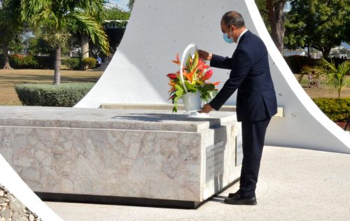 Deputy Prime Minister and Minister of National Security, Hon. Dr. Horace Chang, lays a wreath at the shrine of National Hero, the Rt. Excellent Sir Alexander Bustamante, in honour of the 137th anniversary of his birth, during a floral tribute at National Heroes Park in Kingston on Wednesday, February 24.