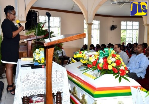 Acting Permanent Secretary in the Ministry of Education, Youth and Information, Dr. Grace McLean (left), addresses the audience at the funeral for Benjamin Bair, which was held at the North Street Seventh-day Adventist Church, on December 8. Benjamin was killed by an unmanned garbage truck on the compound of his school, Clan Carthy Primary in Kingston, on October 28.