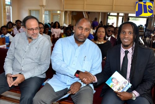 State Minister in the Ministry of Education, Youth and Information, Hon. Alando Terrelonge (right), greets Member of Parliament for South East St Andrew, Julian Robinson, at the funeral for Benjamin Bair, which was held at the North Street Seventh-day Adventist Church on December 8. At left is Member of Parliament for St. Andrew Southern, Mark Golding. Benjamin was killed by an unmanned garbage truck on the compound of his school, Clan Carthy Primary in Kingston, on October 28.