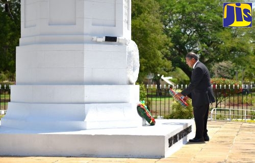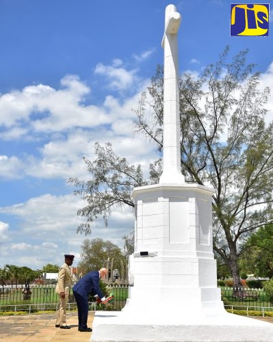 Governor-General, His Excellency the Most Hon. Sir Patrick Allen, lays a wreath at the Cenotaph in National Heroes Park, today (September 15), in memory of the military servicemen who fought in the Battle of Britain in 1940. With the Governor-General is his Aide-de-Camp, Major Fenekie Rowe. The ceremony was staged by the Royal Air Force Association Jamaica (580) Branch.