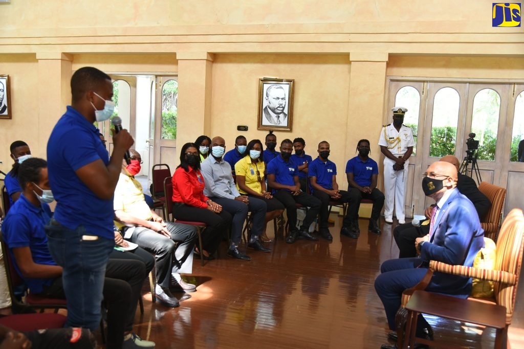 Governor General, His Excellency the Most Hon. Sir Patrick Allen (right, seated), listens to remarks from participant in the JPS Foundation’s Project Fresh Start Jamaica, Romario Hackett (left, standing), during a courtesy call at King’s House on Thursday (September 8).