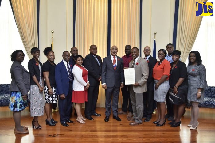 Governor-General, His Excellency the Most Hon. Sir Patrick Allen (left), presents Chairman of the National Council on Drug Abuse (NCDA), Dr. Kevin Goulbourne, with a copy of a Proclamation declaring November as Drug Awareness Month. The Governor-General read the Proclamation during a brief ceremony at King’s House on Thursday (November 1).