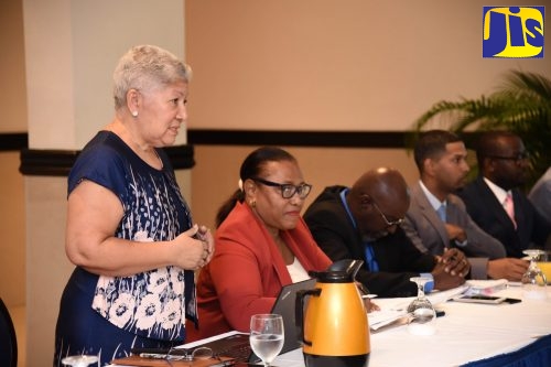 Technical Director, Strategic and Major Projects in the Office of the Prime Minister, Jacqueline Lynch Stewart (standing), clarifies a matter during a meeting with members of the Opposition to discuss the National Identification System (NIDS). Also pictured are other members of the NIDS team. Leader of the Opposition, Dr. Peter Phillips (not pictured) was also in attendance. The meeting took place at The Jamaica Pegasus in New Kingston earlier this year.