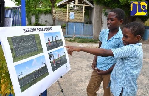 State Minister for Foreign Affairs and Foreign Trade and Member of Parliament for St. Catherine East Central, Hon. Alando Terrelonge (left), converses with Chairman of Musson Foundation, Melanie Subratie, at the ground-breaking ceremony for the construction of a multipurpose court, on Wednesday (May 29), at Gregory Park Primary School in St. Catherine.Gregory Park Primary School students Romaine Johnson (left) and Rayjay Skeen, look at the architectural drawings for the new multipurpose court to be built at the institution in St. Catherine. Occasion was the ground-breaking ceremony for the project on Wednesday (May 29).