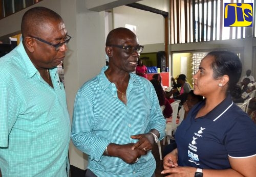 Minister of Local Government and Community Development, Hon. Desmond McKenzie (centre), in conversation with Community and Public Relations Specialist at the Jamaica Energy Partners and West Kingston Power Partners (WKPP), Melissa Newman (right), at the WKPP’s Health and Wellness Fair and Back-to-School Treat, held at the Tivoli Gardens High School on August 16. At left is Councillor, Tivoli Gardens Division, Donovan Samuels.