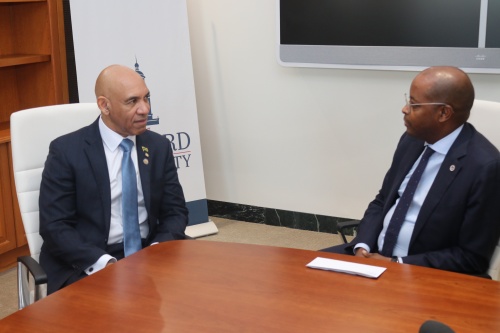 Jamaica’s Ambassador to the United States (US), His Excellency Major General (Ret’d) Antony Anderson (left), speaks with interim President of Howard University, Dr. Wayne A. I. Frederick, during a recent courtesy call on Dr. Frederick at his offices in Washington DC. During the meeting, Dr. Frederick handed over a check in the sum of US$54,000 to assist Jamaica’s hurricane relief efforts.