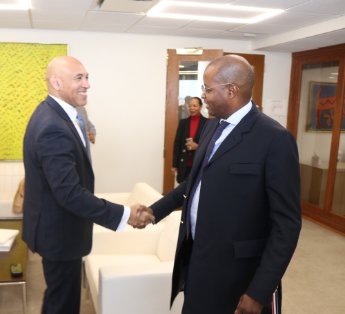 Jamaica’s Ambassador to the United States (US), His Excellency Major General (Ret’d) Antony Anderson (left), is greeted by interim President of Howard University, Dr. Wayne A. I. Frederick, during a recent courtesy call at Dr. Frederick’s offices in Washington DC. Dr. Frederick presented a check in the sum of US$54,000 to Ambassador Anderson to aid in the island’s hurricane relief efforts.