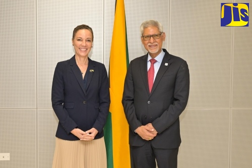 Minister of Foreign Affairs and Foreign Trade, Senator the Hon. Kamina Johnson Smith (left), and Secretary-General of the International Federation of Red Cross and Red Crescent Societies (IFRC), Jagan Chapagain (right), share a moment during a courtesy call on Tuesday (April 21) at the Ministry, downtown Kingston.