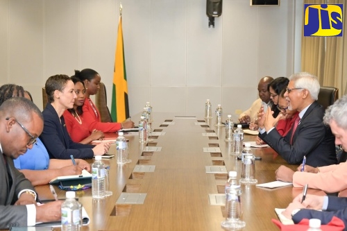 Minister of Foreign Affairs and Foreign Trade, Senator the Hon. Kamina Johnson Smith (seated third left), and other stakeholders listen as Secretary-General of the International Federation of Red Cross and Red Crescent Societies (IFRC), Jagan Chapagain (seated second right), speaks during a courtesy call on Tuesday (April 21) at the Ministry’s Office in Kingston.