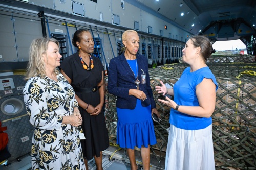 Minister of Finance and the Public Service, Hon. Fayval Williams (left), and Ambassador of Belgium to Jamaica, Ellen De Geest, welcome the arrival of 200 generators donated by the Government of Belgium to support the island's hurricane relief efforts, at the Norman Manley International Airport (NMIA) in Kingston on Wednesday (November 5).