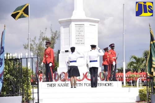 Officers of the Jamaica Defense Force during the laying wreaths at the Cenotaph at National Heroes Park, today (November 10) during the Remembrance Day ceremony. Traditionally, Remembrance Day, also known as Armistice Day or Poppy Day is observed on the second Sunday in November, and its primary purpose is to pay homage to those who gave their service and, ultimately, their lives in the two great wars.