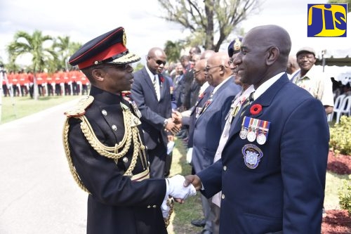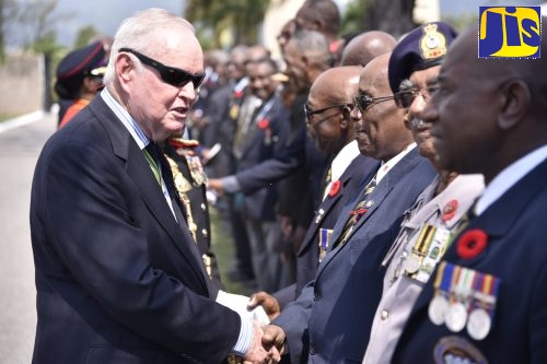 Jamaica Defense Force Chief of Defence Staff, Lieutenant General Rocky Meade greeting former World War II servicemen and servicewomen at the Remembrance Day ceremony held at National Heroes Park in Kingston on November 10. Traditionally, Remembrance Day, also known as Armistice Day or Poppy Day is observed on the second Sunday in November, and its primary purpose is to pay homage to those who gave their service and, ultimately, their lives in the two great wars.