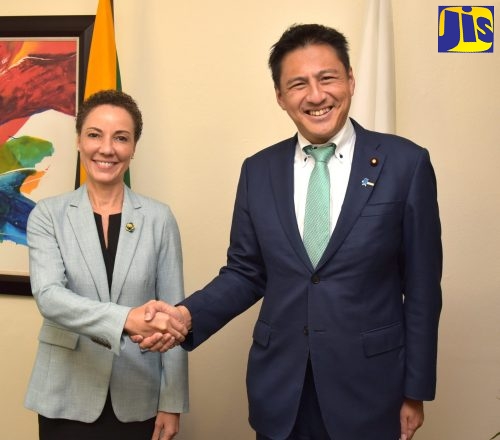 Minister of Foreign Affairs and Foreign Trade, Senator the Hon. Kamina Johnson Smith (left), greets State Minister for Foreign Affairs, Japan, Takei Shunsuke, before the start of a bilateral meeting held at The Jamaica Pegasus hotel in New Kingston on May 17.