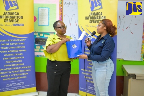 Special Projects Officer at the Jamaica Information Service (JIS), Romona Geohaghan (right), presents a package containing books, posters and other publications to Acting Principal at Greenwich Primary School in Kingston, Andrea Richards. The JIS team stopped at the institution on Wednesday (October 1) as part of its annual Heritage School Tour in observance of Heritage Month in October. The school visits include presentations of heritage materials and cultural displays from students and teachers.