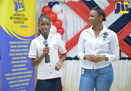 Head Girl at Rousseau Primary School in Kingston, Brooklyn Barrett (left), shares her views on what culture means to her, while Social Media Administrative Assistant at the Jamaica Information Service (JIS), Denisha Chambers, listens. The JIS team stopped at the institution on Wednesday (October 1), as part of its annual Heritage School Tour in observance of Heritage Month in October.