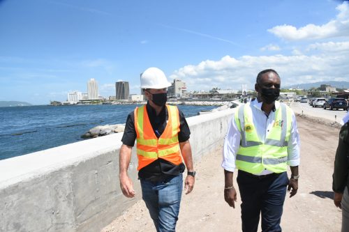 Managing Director, Jamaica Social Investment Fund (JSIF), Omar Sweeney (right), and Operations Director, S&G Road Surfacing Materials Ltd, James Sampson, tour sections of the Port Royal Coastal Revetment Project recently to view work being undertaken. The World Bank loan-funded development is being coordinated by JSIF and implemented under the Disaster Vulnerability Reduction Project (DVRP). The project aims to create protective infrastructure along the Port Royal Street corridor that will safeguard it against the effects of potential storm surges resulting from climate change. This thoroughfare is deemed integral to the east-west transportation network in the Kingston Metropolitan Area (KMA).