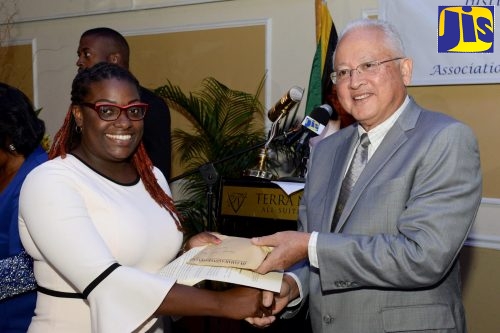 Justice of the Peace, Sheniqua Tashana Baker (left), receives her seal from Minister of Justice, Hon Delroy Chuck, at the commissioning ceremony for Justices of the Peace for the Parish of St. Andrew, at the Terra Nova Hotel, in Kingston, on October 12.