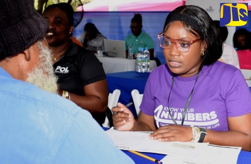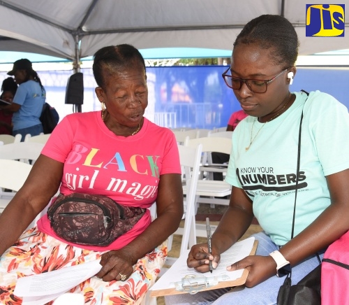 Health Records Technician, Ministry of Health and Wellness, Kaneesha Williamson (right), takes health information from a member of the public during the Kingston and St. Andrew leg of the Ministry’s ‘Know Your Numbers’ campaign at the Saint William Grant Park, downtown Kingston, on Thursday, February 1. Persons who attended benefited from blood pressure, blood sugar, cholesterol, Body Mass Index (BMI), vision and dental checks, and denture impressions. The ‘Know You Numbers’ campaign seeks to encourage more Jamaicans to get screened for lifestyle diseases.Records Officer for the Southeast Regional Health Authority (SERHA), Tameka Smith (right), writes down health information provided by Gwendolyn Brown at the Kingston and St. Andrew leg of the Ministry of Health and Wellness’ ‘Know Your Numbers’ screening campaign at the Saint William Grant Park, downtown Kingston, on Thursday, February 14.