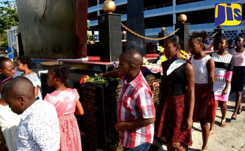 Children attending the Kingston and St. Andrew Municipal Corporation’s (KSAMC) Child Month wreath laying ceremony, lay flowers at the Crying Child Monument in downtown Kingston where the event was held on Sunday (May 5), in memory of youngsters who have died tragically. The event formed part of the KSAMC’s Child Month activities during May under the theme: ‘Encourage, Enable, Include Me’.