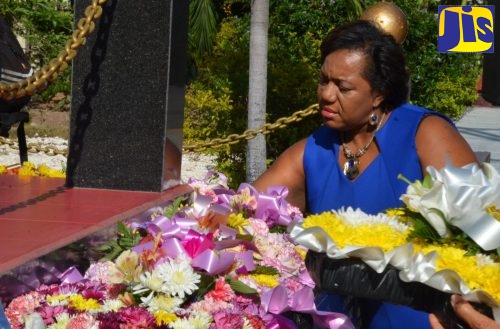 Child Protection and Family Services Agency (CPFSA) Chief Executive Officer, Rosalee Gage Gray, lays flowers at the Crying Child Monument in downtown Kingston, during the Kingston and St. Andrew Municipal Corporation’s (KSAMC) Child Month wreath laying ceremony on Sunday (May 5). The ceremony was held in memory of children who have died tragically. The event formed part of the KSAMC’s Child Month activities during May under the theme: ‘Encourage, Enable, Include Me’.