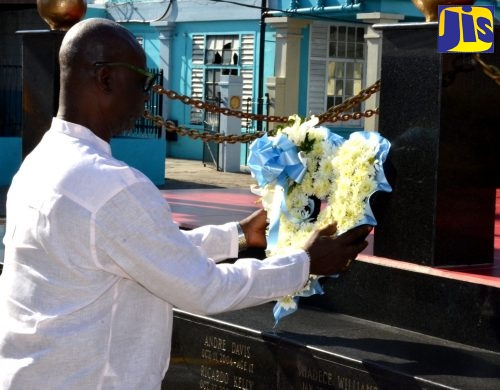 Local Government and Community Development Minister, Hon. Desmond McKenzie, lays flowers at the Crying Child Monument in downtown Kingston, during the Kingston and St. Andrew Municipal Corporation’s (KSAMC) Child Month wreath laying ceremony on Sunday (May 5). The ceremony was held in memory of children who have died tragically. The event formed part of the KSAMC’s Child Month activities during May under the theme: ‘Encourage, Enable, Include Me’.