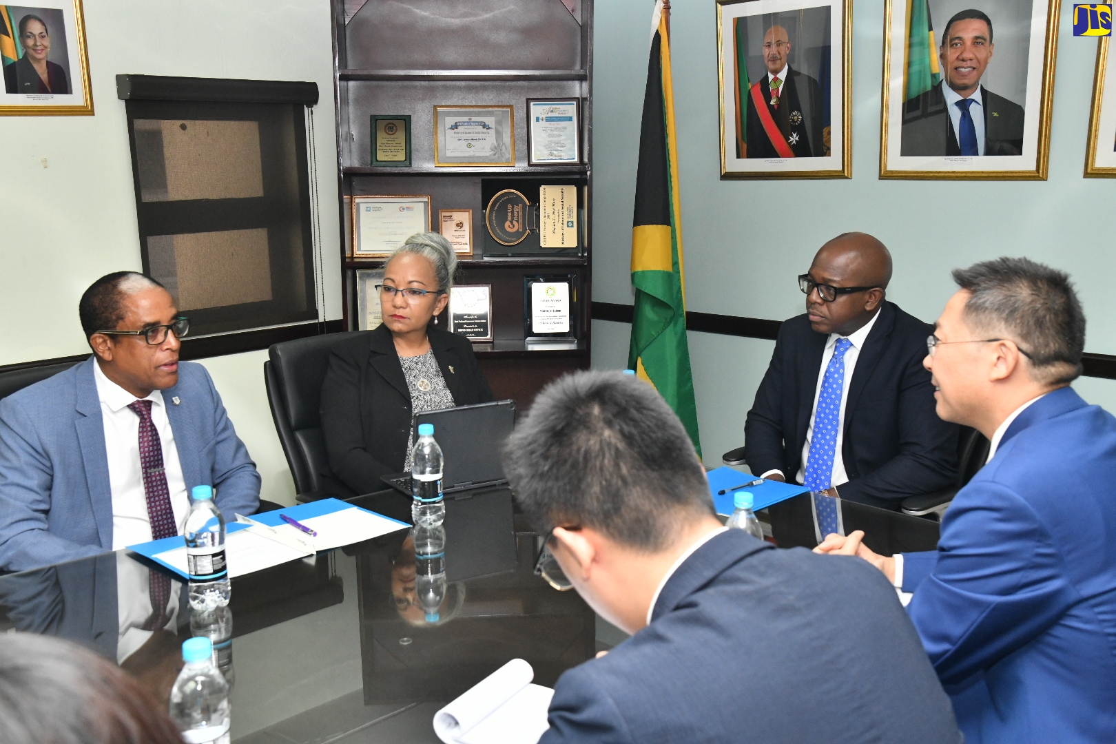 Labour and Social Security Minister, Hon. Pearnel Charles Jr (right), listens to remarks by State Minister, Hon. Dr. Norman Dunn (left), during a meeting with Ambassador of the People’s Republic of China to Jamaica, His Excellency Chen Daojiang (second right), at the Ministry’s North Street offices on August 2. Permanent Secretary in the Ministry, Colette Roberts Risden, was also at the meeting.