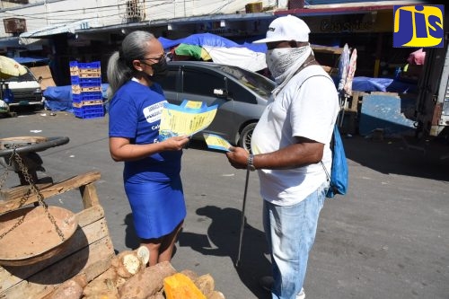 : Permanent Secretary in the Ministry of Labour and Social Security, Colette Roberts-Risden (left) hands a flyer to a vendor in downtown Kingston on February 14 as part of measures to generate awareness among citizens about the Disabilities Act. The legislation, which promotes and protects the rights of persons with disabilities, came into full effect on Monday, February 14, 2022.