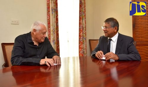 Minister without Portfolio in the Office of the Prime Minister, Hon. Michael Henry (left), greets British High Commissioner to Jamaica, His Excellency Asif Ahmad, when he called on the Minister at Jamaica House on Thursday (August 15).