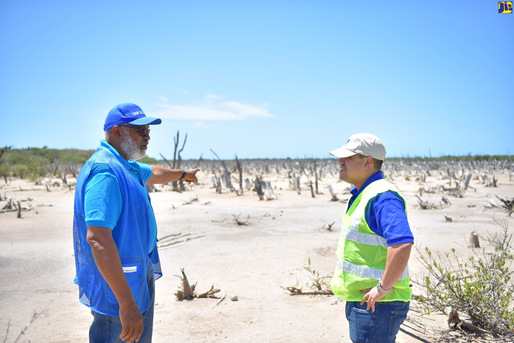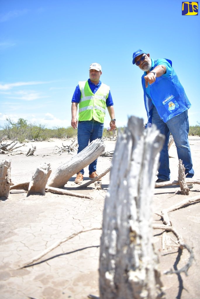 Min. Samuda looks at map showing Mangrove areas in Clarendon while being briefed by Professor Terrence Forrester, Chief Scientist & Managing Director, UWI Solutions for Developing Countries (SODECO).