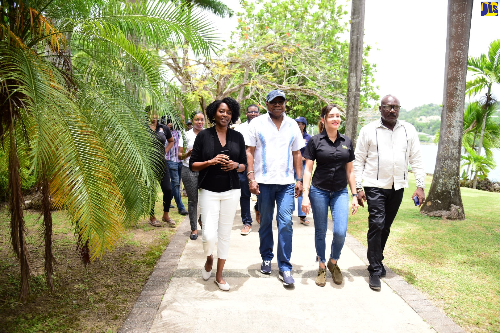 Minister of Tourism, Hon. Edmund Bartlett (left) and Permanent Secretary in the Tourism Ministry, Jennifer Griffith (second left), engage with raft operators during the recent destination assurance tour of sections of Portland where he and other representatives met and engaged with parish stakeholders. The visit formed part of a series of islandwide tours of tourism entities and national stakeholder and public consultations on the Tourism Ministry’s Destination Assurance Framework and Strategy (DAFS). The DAFS serves as a long-term blueprint to guide the Ministry and its partners to strengthen, further develop and implement strategies that will ensure continuous improvement in the delivery and management of quality outputs throughout the tourism value chain.