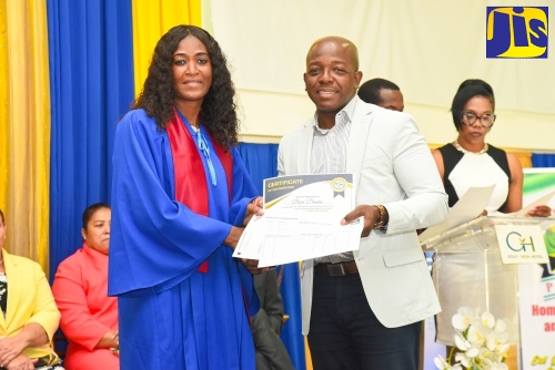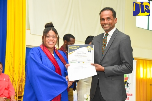 Managing Director, Central Jamaica Social Development Initiative (CJSDI), Damion Young, addresses Sunday’s (December 10) graduation ceremony for the CJSDI Hospitality Training Programme, at Golf View Hotel in Manchester.Executive Director, Tourism Enhancement Fund, Dr. Carey Wallace, presents graduate of the Central Jamaica Social Development Initiative (CJSDI) Hospitality Training Programme, Keneshia Berith, with a certificate of participation during Sunday’s (December 10) graduation ceremony at Golf View Hotel in Manchester.Minister of Labour and Social Security, Hon. Pearnel Charles Jr., presents graduate of the Central Jamaica Social Development Initiative (CJSDI) Hospitality Training Programme, Bisie Dennis, with a certificate of participation during Sunday’s (December 10) graduation ceremony at Golf View Hotel in Manchester.