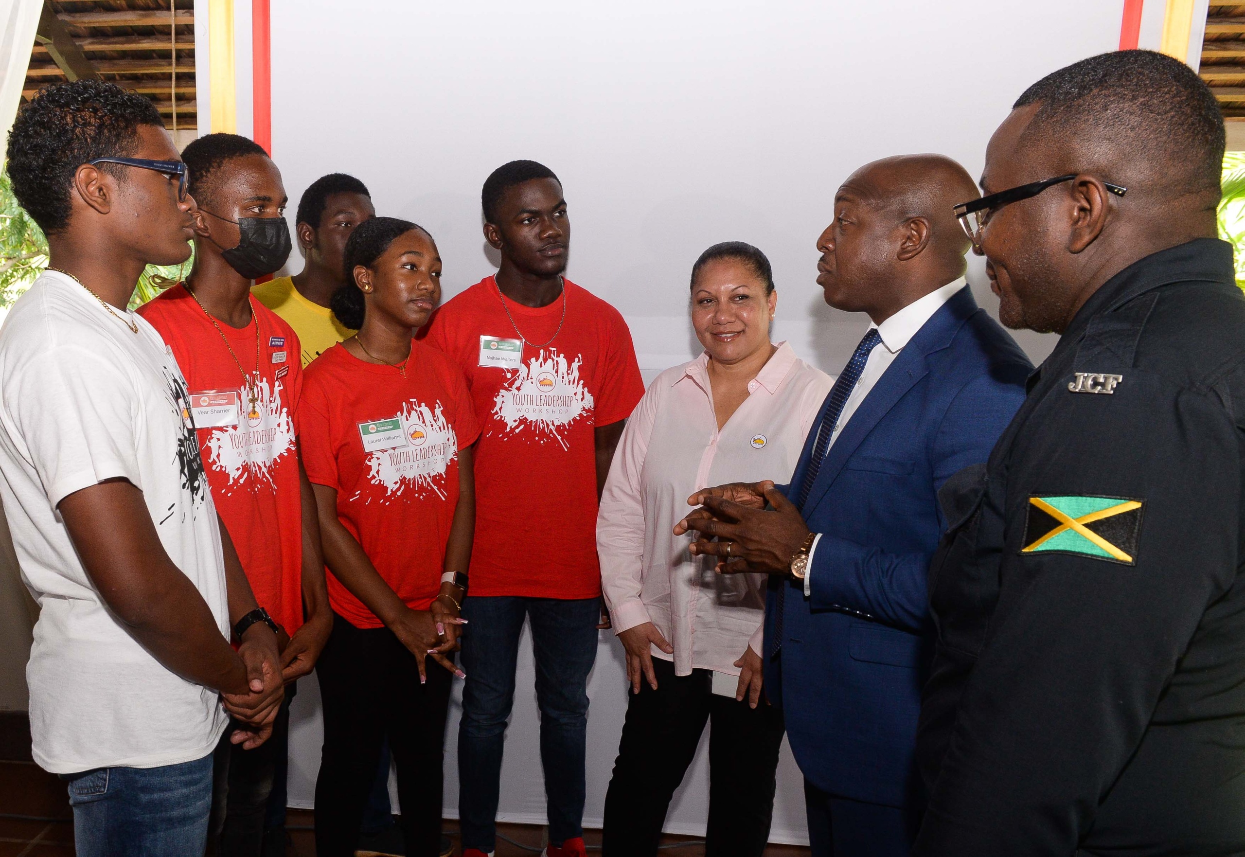 Minister of Labour and Social Security, Hon. Pearnel Charles Jr., (second right), engages with participants in the 2023 Juici Patties Youth Leadership Workshop and Volunteer Programme, during a session held at The Verandah, Juici’s Empowerment Park, in Clarendon on Tuesday (July 11). Looking on are Chief Operations Officer and Director of Juici Patties, Edith Chin (third right) and Sergeant Leroy Chambers (right) from the Jamaica Constabulary Force’s Clarendon Community Safety and Security Branch. Roughly 200 senior high school students were engaged in the leadership, team building, volunteerism and conflict resolution workshop.