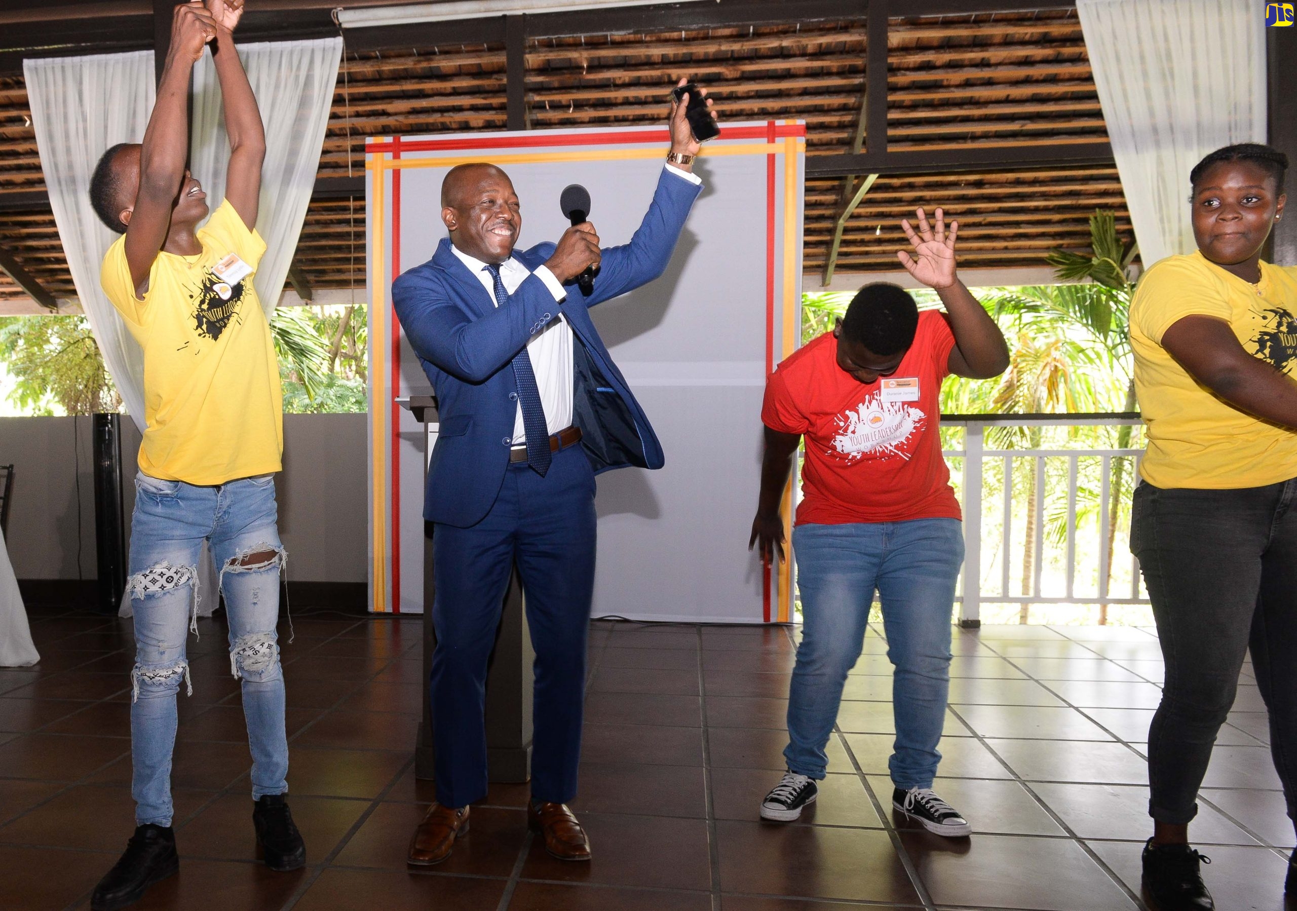 Minister of Labour and Social Security, Hon. Pearnel Charles Jr., dances along with student leaders at the 2023 Juici Patties Youth Leadership Workshop and Volunteer Programme held at The Verandah, Juici’s Empowerment Park, in Clarendon on Tuesday (July 11).