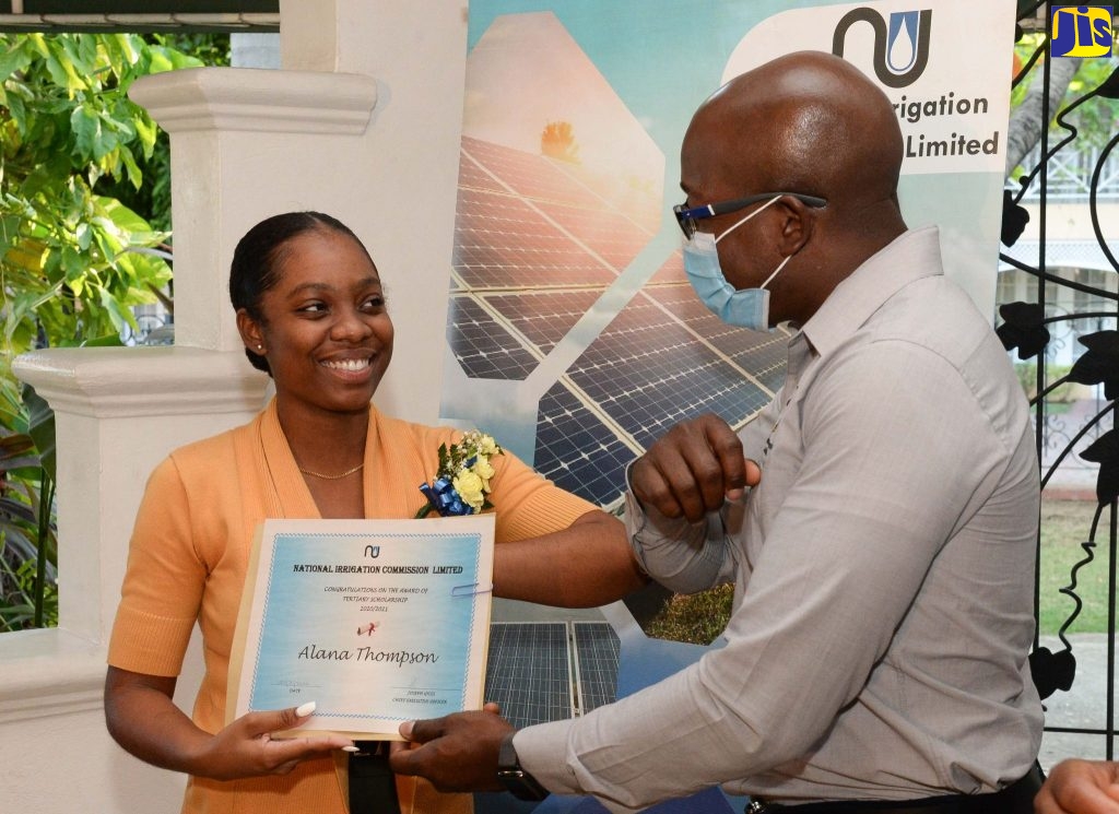 Minister of Agriculture and Fisheries, Hon. Pearnel Charles Jr. (right), presents Tiana Gordon with a tertiary scholarship from the National Irrigation Commission (NIC)for the period 2020/21. The presentation was made during a function held on March 24 at Hotel Four Seasons in St. Andrew. The NIC launched the scholarship awards in 1998 as part of its corporate social responsibility programme.