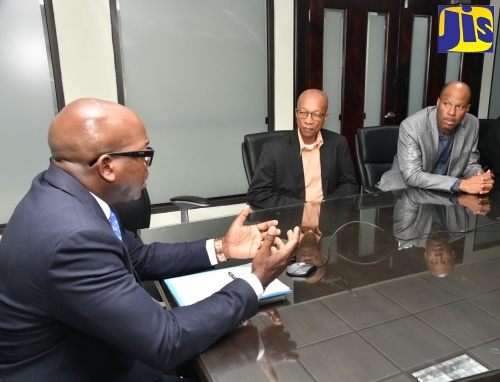 Minister of Labour and Social Security, Hon. Pearnel Charles Jr. (left), engages trade union representatives in discussion on labour matters, during a courtesy call at the Ministry’s North Street offices in Kingston on Wednesday (March 6). Listening (from second left) are President of the Caribbean Congress of Labour, André Lewis; and President, Jamaica Confederation of Trade Unions, St. Patrice Ennis.