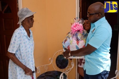 Minister of Labour and Social Security, Hon. Pearnel Charles Jr., shares pleasantries with centenarian and resident of Comfort District, Toll Gate, Clarendon, Enid Daley, after presenting her with a gift basket on Friday (October 6). Ms. Daley was among several residents in the parish receiving gift baskets from Minister Charles in commemoration of Senior Citizens Month.