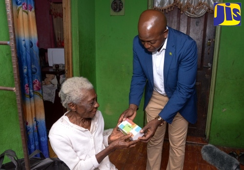 Minister of Labour & Social Security, Hon. Pearnel Charles Jr, presents a gift to 88-year-old Evelyn Taylor of Henley Road in Kingston. Ms. Taylor, who suffers from several chronic conditions, has been a beneficiary of the National Council for Senior Citizens (NCSC) since 2020. The Minister paid Yuletide visits to senior citizens in Kingston on Thursday (December 21), to offer support and underscore the Ministry’s commitment to the welfare and well-being of the elderly.