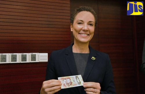 Minister of Foreign Affairs and Foreign Trade, Senator Hon. Kamina Johnson Smith, displays one of the new banknotes commemorating Jamaica 60th anniversary that will soon be in circulation. This was following the Jamaica-United Kingdom strategic dialogue with Secretary of State for Foreign, Commonwealth and Development Affairs of the United Kingdom, the Rt. Hon. James Cleverly at the Ministry’s downtown Kingston offices on May 19.