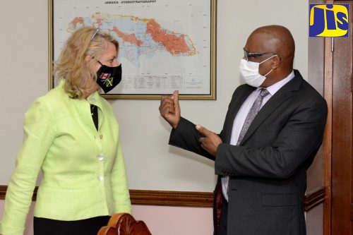 Minister without Portfolio in the Ministry of Economic Growth and Job Creation, Hon. Leslie Campbell, converses with Canada’s High Commissioner to Jamaica, Her Excellency Laurie Peters, during her courtesy call at the Ministry’s offices on Dominica Drive in New Kingston. on Thursday (July 9). They discussed wide-ranging matters of mutual interest, including projects and programmes being undertaken to bolster Jamaica’s climate resilience and environmental sustainability with funding and technical support from Canada.