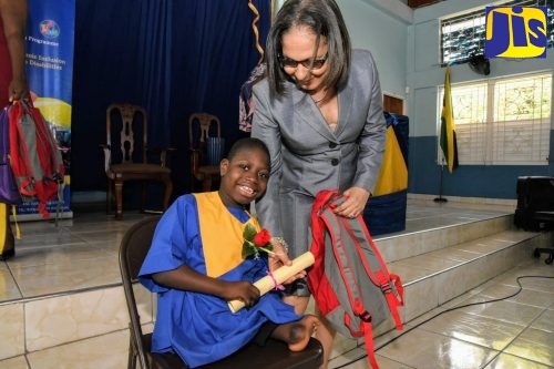 : Minister of Labour and Social Security, Hon. Shahine Robinson (right), presents Dandre Simpson with a backpack and certificate at the Early Stimulation Programme (ESP) transitional exercise, held at the Apostolic Church of Jamaica Bethel Temple, Kingston Gardens, on July 10. The ESP is an early intervention programme for young children (0-6 years) with various types of developmental disabilities. A total of 60 students graduated from the ESP, 50 of whom will be matriculating to primary special education, and 10 students to the regular school system.