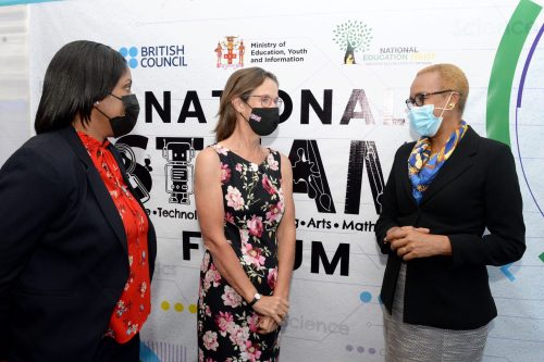 Minister of Education, Youth and Information, Hon. Fayval Williams (right), is in discussion with (from left), Director, Donor and Partnership Management, National Education Trust (NET), Latoya Harris; and British High Commissioner to Jamaica, Her Excellency, Judith Slater. Occasion was the National Science, Technology, Engineering, Arts and Mathematics (STEAM) Forum staged by NET at the Spanish Court Hotel in New Kingston on Thursday (Dec. 9). The event was held under the theme: ‘Setting the stage for a national vision on STEAM Education in Jamaica.’