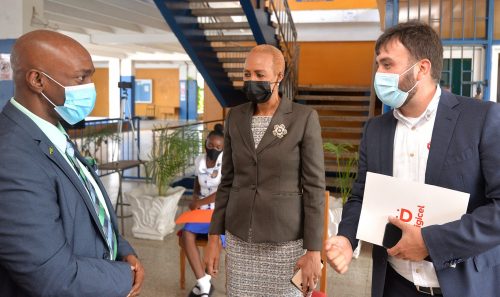 Minister of Education, Youth and Information, Hon. Fayval Williams (centre), shares in conversation with (from left) Principal, Jose Marti Technical High School, Rev. Dr. Austin Wright and Chief Executive Officer, Digicel Jamaica, Jabbor Kayumov. Occasion was a ceremony for the presentation of a cheque valued at $1 million to Jose Marti, for winning Digicel’s BiP2Win competition. The ceremony was held at the school in St. Catherine on May 13.