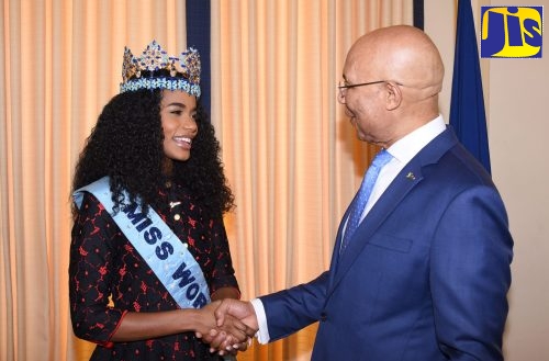 Governor-General, His Excellency the Most Hon. Sir Patrick Allen (right), greets Miss World 2019, Toni-Ann Singh, when she called at King’s House, today (December 23).