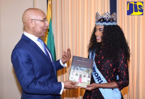 Governor-General, His Excellency the Most Hon. Sir Patrick Allen (left), presents a book, entitled, ‘Behind the Scenes at King’s House, 1873-2010’, by Jackie Ranston to Miss World 2019, Toni-Ann Singh, during a visit to King’s House, today (December 23).
