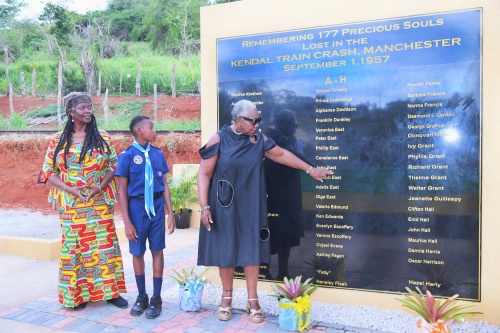 Author and document examiner, Beverly East (right), points to the name of one of her 14 relatives who perished in the Kendal Crash on September 1, 1957, in Manchester. With her are (from left) entertainer Sister Carol, and boy scout Ajahami Majurie. The monument was unveiled close to the crash site in Kendal, Manchester, on September 11.