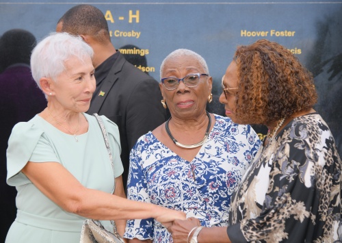 Survivor of the September 1, 1957 Kendal crash, Cynthia Desulme (left), speaks with Minister of Culture, Gender, Entertainment and Sport, Hon. Olivia Grange (right), following the unveiling of the monument in memory of the victims on September 11. With them is Daphne Innerarity.