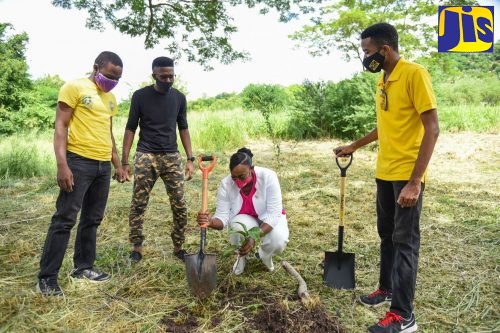 Member of Parliament for East Rural St. Andrew, and wife of Prime Minister, the Most Hon. Andrew Holness (second left) plants a tree in observance of National Tree Planting Day today (October 2) at the Papine High School. Others (from left) are: Principal of the school, Clayton Christie; St Andrew East Rural youth parliamentarian, O’Neil Dowe; and youth volunteer, Johanna Davy.