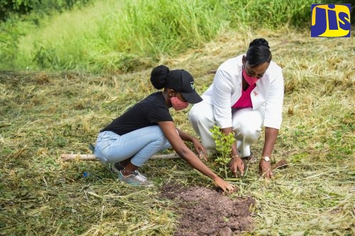 Member of Parliament for East Rural St. Andrew, and wife of Prime Minister, the Most Hon. Andrew Holness (right) is assisted by youth volunteer, Johanna Davy to plant a tree in observance of National Tree Planting Day today (October 2) at the Papine High School.