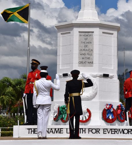 Chief of Defence Staff, Lt. General Rocky Meade (right), salutes fallen soldiers at the National Memorial Wreath- Laying Ceremony at National Heroes Park in Kingston on November 11. The event was held to remember and honour military veterans who died in service to the country, particularly those who died in battle or as a result of wounds sustained in battle.