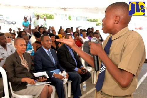 Student, Maverley Primary and Junior High School, Mathew Millwood, performs during the opening ceremony for a new computer lab/access point at Maverley Primary and Junior High School, on Wednesday (May 15). At left are Minister of Science, Energy and Technology, Hon. Fayval Williams; and Minister of Finance and the Public Service, Dr. the Hon. Nigel Clarke.